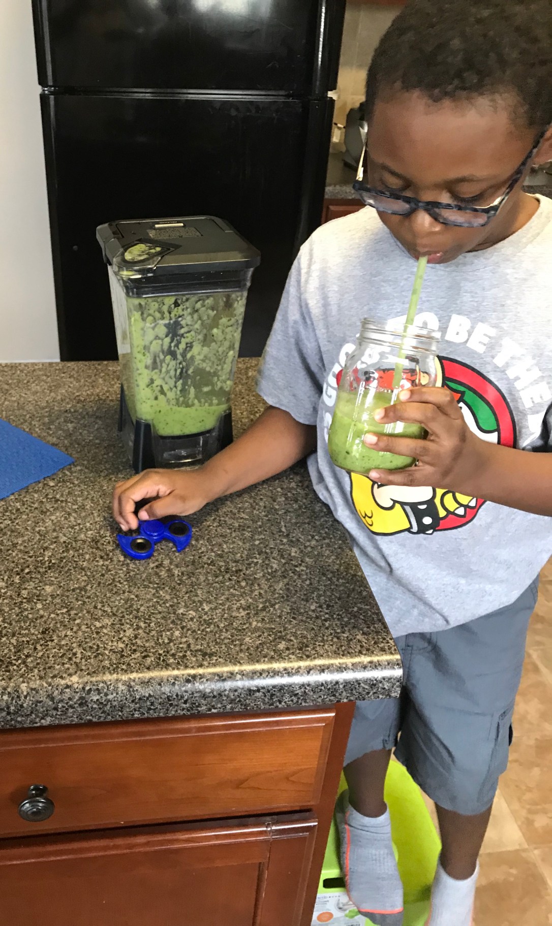 So what did he learn from our mini unit using the Reduce Reuse Recycle Kids Night In Box. He learned what it means to recycle and why we should. We explored learning that everyday items we may think are trash can actual be upcycle for art projects or repurposed. He also learned that not all things can be recycle and how to properly sort recycle items into 4 different categories. He made us some delicious green smoothies that will also be in heavy rotation in our home.