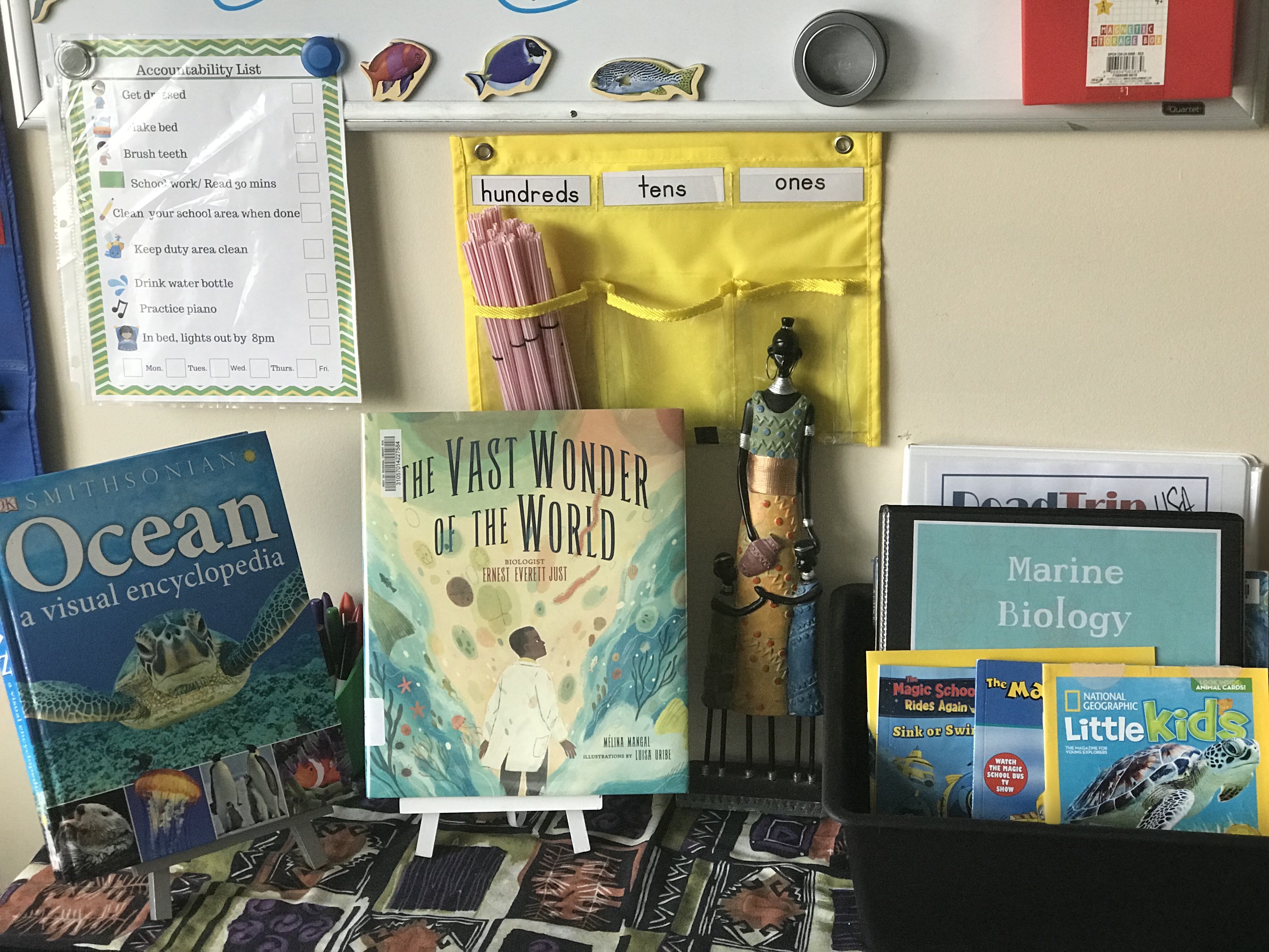 One of the things I felt was important to include in this unit study for my son was marine biologist. I have chosen Roger Arliner Young, Ernest Everett Just and Ayana Elizabeth Johnson. I had him pick out a few books about coral reefs and animals of interest from the ocean.