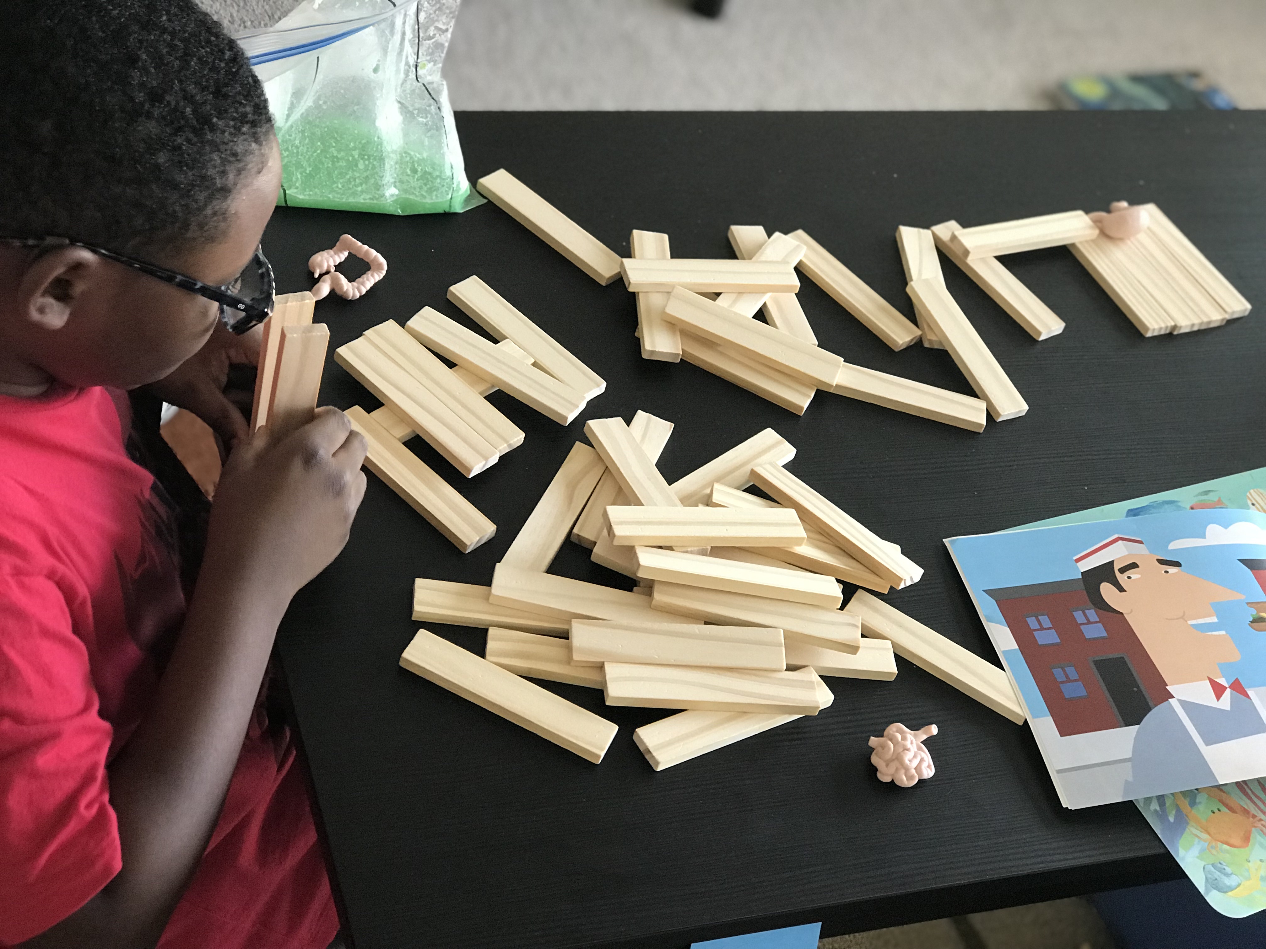 We used the Brain Blox Wooden Building Planks apart of our math lessons with place value and as manipulative for working on multiplication. We used them in our science lesson to study force and motion by building a chain reaction experiment. He also took them out while we were studying the digestive system so he could use them as a model on how food travels through the digestive track. This week we using them to build the Forbidden City in China along side our unit study!