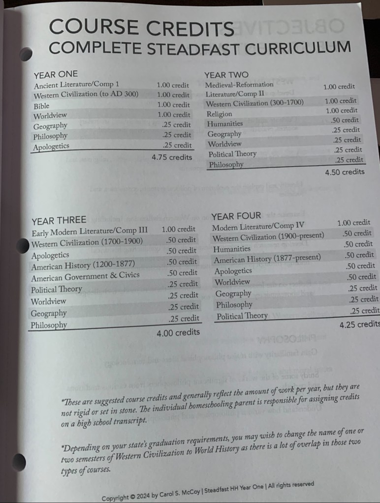 This is a full four-year high school humanities program, making it a strong spine for families who want continuity and depth throughout grades 9–12. Each year builds on the last, developing stronger analytical, writing, and discussion skills. Students can earn 17.5 credits just by using this curriculum and parents will only need to add math, science and foreign language.