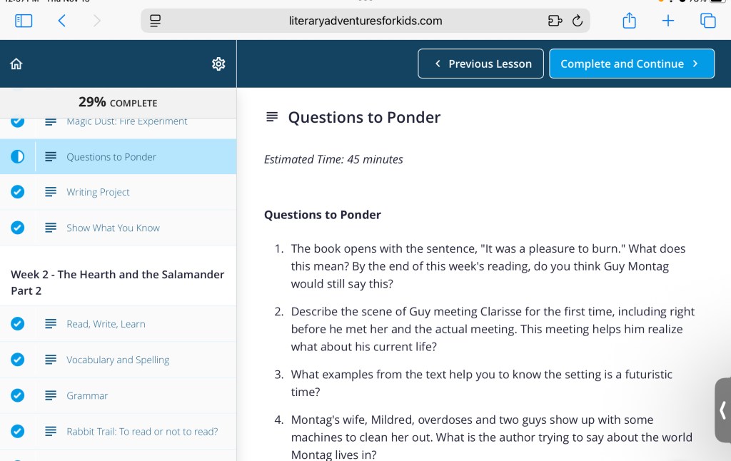 The Fahrenheit 451 study was the perfect blend of analytical, creative, and reflective learning. Each module invited my son to slow down and consider the symbolism that runs throughout the book. The platform included context about book banning, historical events that shaped Bradbury’s writing, and discussions that helped my son articulate his thoughts clearly and confidently.